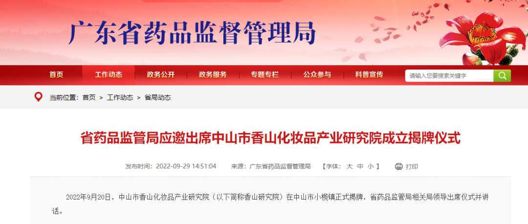 2022年9月20日,中山市香山化妆品产业研究院(以下简称香山研究院)在中山市正式揭牌,省药品监管局相关局领导出席仪式并讲话。